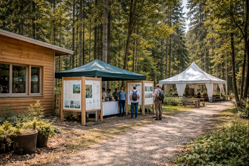 - Eine Beteiligung ist entlang eines Rundwegs im Wald oder auf einer Zeltwiese möglich.